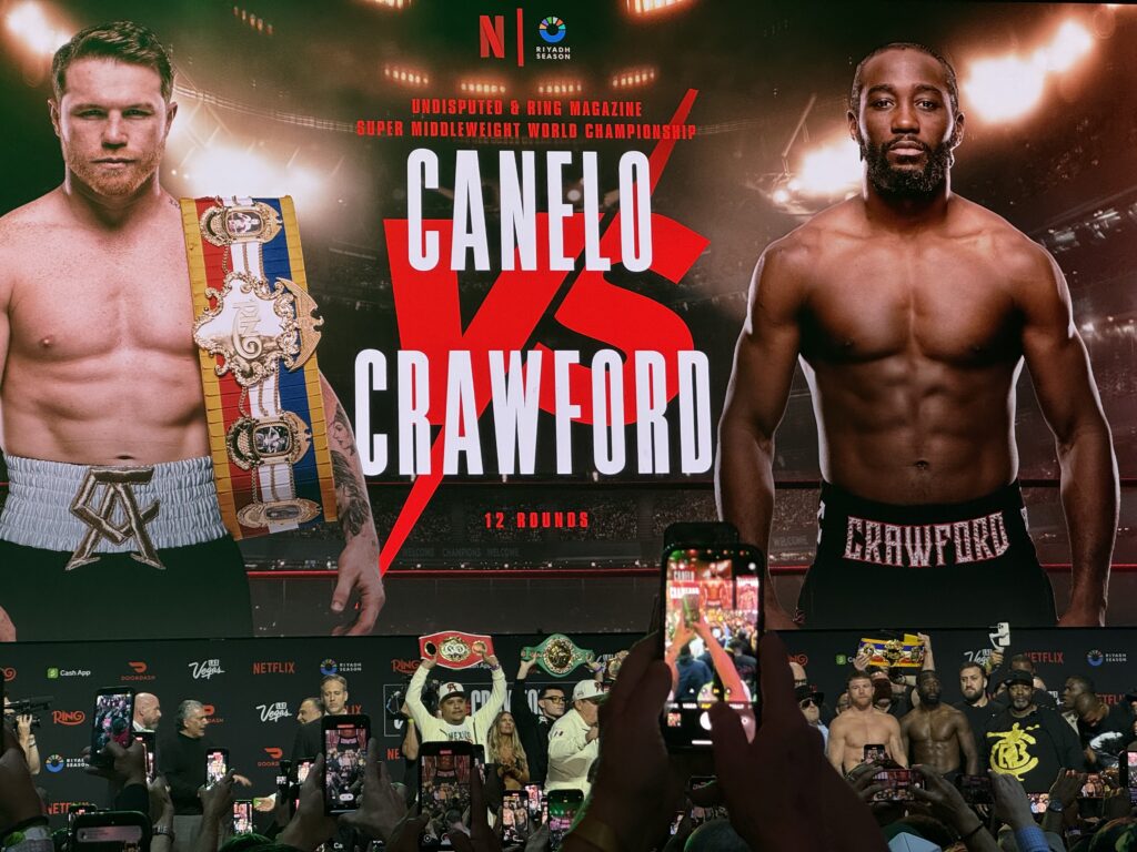 Inmediatamente después, me dirijo al T-Mobile Arena, donde se celebra la rueda de prensa oficial. Como de costumbre, lo primero que tengo que hacer es hacer cola para acreditarme. El espectáculo empieza a las 17.00 en punto. Los luchadores de la cartelera responden a las preguntas, pero el ambiente sólo se caldea cuando «Bud» Crawford sube al escenario. Los abucheos del público son inconfundibles, un contraste con los frenéticos vítores que Canelo recibe poco después. Aprovecho la oportunidad para hacer una pregunta a ambas estrellas sobre sus primeros combates y el largo camino que han recorrido hasta la fecha. El público responde con respeto, y por un momento la arena queda libre de abucheos.