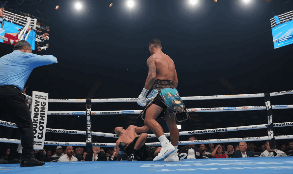 Der entscheidende Moment kam in der achten Runde – ein Schlag aus dem Nichts. Beide Cruisergewichte bewegten sich weitgehend ohne harte Aktionen im Ring, doch dann setzte der Australier einen rechten Jab, gefolgt von einer knallharten linken Geraden voll aufs Kinn. Cinkara sackte zusammen, und Ringrichter Chris Flores brach den Kampf sofort ab.