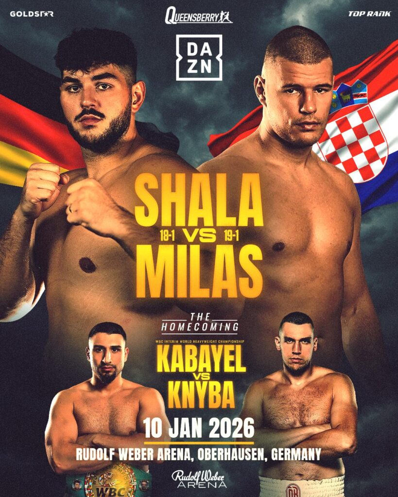 Am 10. Januar kommt es in der Rudolf Weber Arena zur Schwergewichtskollision zwischen AGON-Hoffnung Granit Shala und dem kroatischen Top-Mann Petar Milas. Die beiden treffen im Co-Mainevent von Agit Kabayels großem „Homecoming“-Event gegen den Polen Damian Knyba vor 13.000 Fans aufeinander.